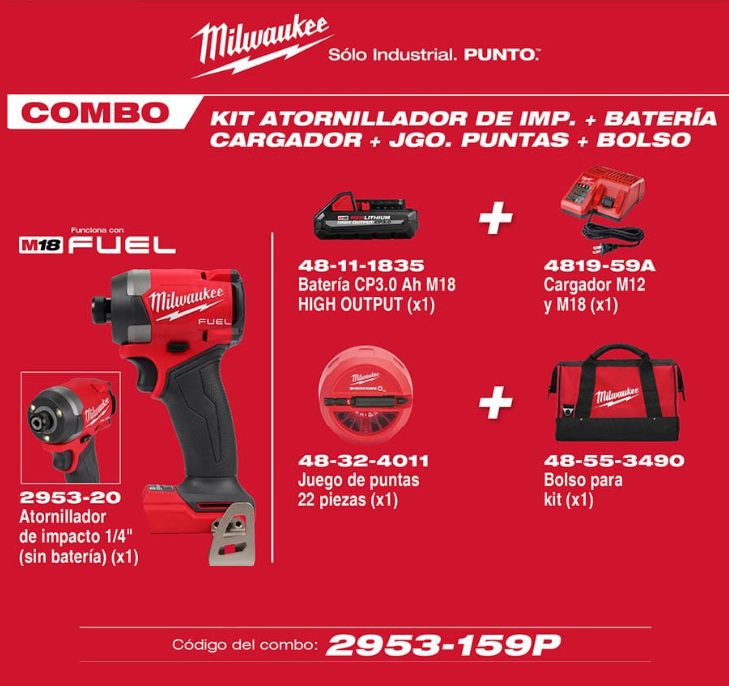 Combo Atornillador De Impacto Milwaukee M18 Fuel + Cargador Doble Batería 18v 12v y Batería M18 3Ah + Bolso y kit de puntas 2953