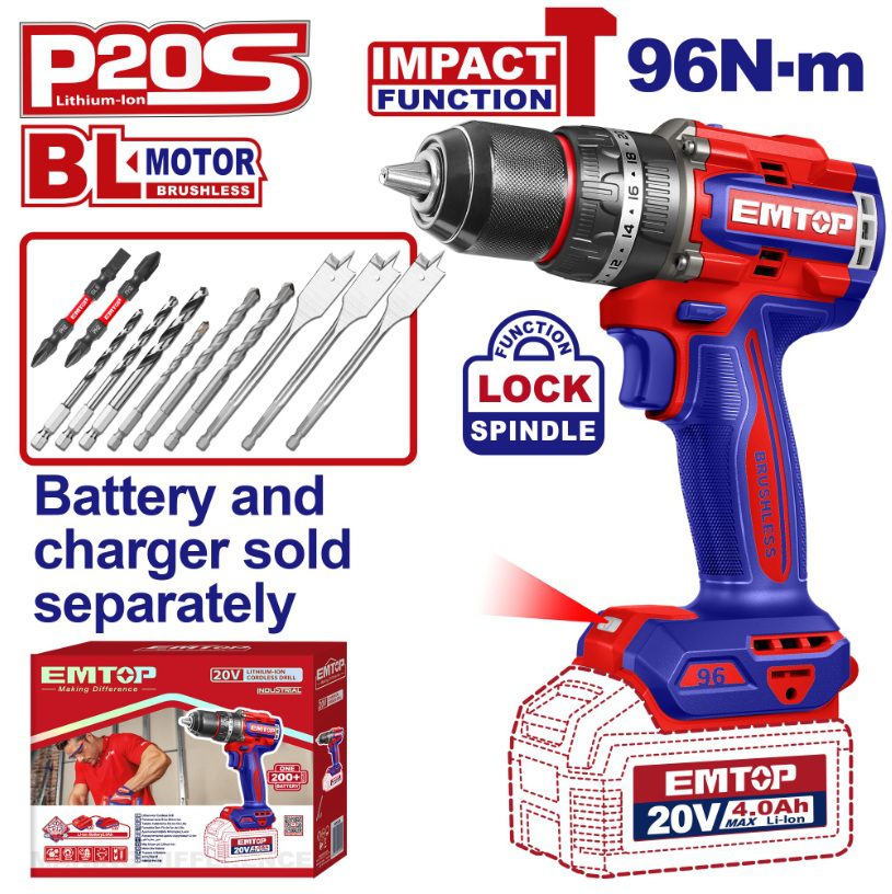 Taladro Atornillador Percutor Inalámbrico 96 Nm Mandril Metal Ø 13 Mm Brushless ECIDL209681 EMTOP