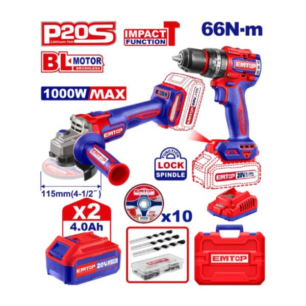 Emtop Combo Amoladora + Taladro Atornillador 20 V C/ 2 Baterias 4amp