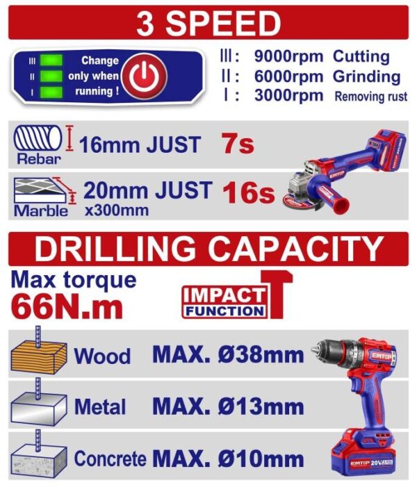 Potencializa tu trabajo con el Combo Taladro Percutor y Amoladora Brushless de Emtop, diseñado para satisfacer las necesidades de los profesionales y entusiastas del bricolaje. Este versátil conjunto incluye una amoladora de alto rendimiento y un taladro percutor potenciado por batería de 20v, brindando la libertad de movimiento sin depender de una fuente de alimentación fija.