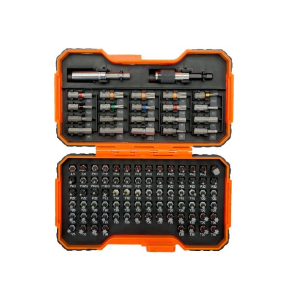 Incluye 100 piezas: 97 puntas + 1 portapuntas universal magnético KM653 + 1 portapuntas magnético de liberación rápida KM653-QR + 1 adaptador para vasos de 1/4″.
