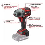 La llave de Impacto Inalámbrica TP-CW 18/750-C Li BL-Solo de Einhell Professional es un equipo potente para trabajos de atornillado fuertes y un cambio de neumáticos sencillo. Como miembro de la familia Power X-Change, La llave de Impacto Inalámbrica puede usarse con todas las baterías y cargadores de la serie del sistema. El equipo se acciona por un motor brushless de Einhell. Este motor sin carbones ofrece más potencia y una vida útil más prolongada que los motores de carbones de carbono convencionales. Tras un registro online se aplican 10 años de garantía en el motor brushless. Compacto, ligero y potente: La llave de Impacto Inalámbrica tiene un diseño un 20 % más compacto en comparación con un llave de Impacto de Einhell similar y, al mismo tiempo, es mucho más potente. Así, es lo más flexible y manejable posible. Aflojar y apretar los tornillos es el ejercicio más fácil para el atornillador gracias a su potente mecanismo de impacto. La llave de Impacto profesional dispone de un alojamiento cuadrado exterior de 1⁄2″ (12,7 mm) y tiene un máx. par de 750 Nm. El par de aflojamiento máx. es de 1000 Nm. El par y la velocidad se pueden adaptar de forma óptima al material respectivo en tres etapas. Con la ayuda de la etapa de parada automática adicional, los tornillos y tuercas de las ruedas se pueden apretar de forma óptima, ya que La llave de Impacto se detiene a aprox. máx. 100 Nm para evitar un apriete excesivo y posibilitar el apriete con llave dinamométrica. Al desenroscar los tornillos, el equipo se detiene automáticamente en la etapa de parada automática tan pronto como no se detecta resistencia. Gracias al adaptador de puntas hexagonal interior incluido, también es posible atornillar sin problemas tornillos de madera grandes y largos. El atornillador está equipado con LED integrados que garantizan las mejores condiciones de visibilidad. Gracias al clip para cinturón, La llave de Impacto Inalámbrica se puede fijar rápida y fácilmente al cinturón durante el trabajo para tener las manos libres. También se incluye un práctico set de llaves para el cambio de neumáticos en el alcance del envío. El envío se realiza sin batería ni cargador, estos son adquiribles por separado.