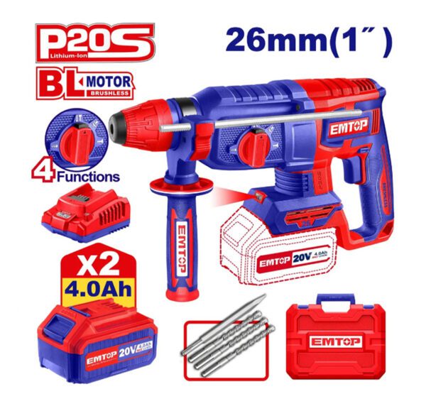 Rotomartillo Emtop 20v Combo + 2 Baterias 4amp + Cargador 2,5J