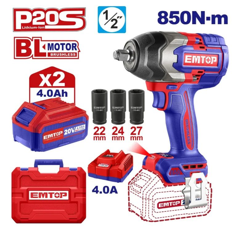 Llave de Impacto a Batería Inalámbrica 1/2″ 20V 850Nm Motor Brushless + 2 Baterías 4.0Ah + Cargador EMTOP ECIWL2085-4